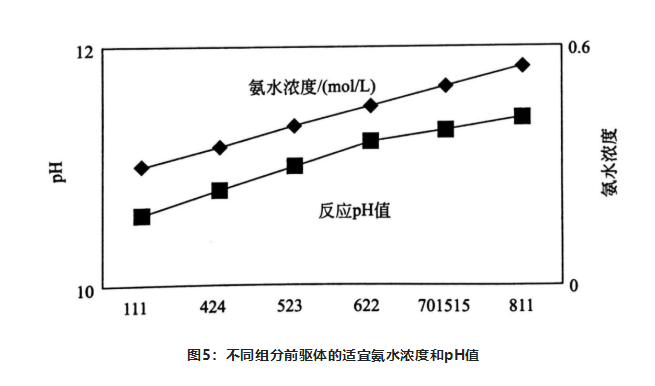 氨水是反應(yīng)絡(luò)合劑,主要作用是絡(luò)合金屬離子,達(dá)到控制游離金屬離子目的,降低體系過(guò)飽和系數(shù),從而實(shí)現(xiàn)控制顆粒長(zhǎng)大速度和形貌。所以制備不同組成的三元前驅(qū)體,所需的氨水濃度也不同。