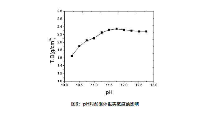 隨著沉淀pH值升高,一次粒子逐漸細(xì)化,顆粒球形度變好,前驅(qū)體樣品振實(shí)密度逐步升高。